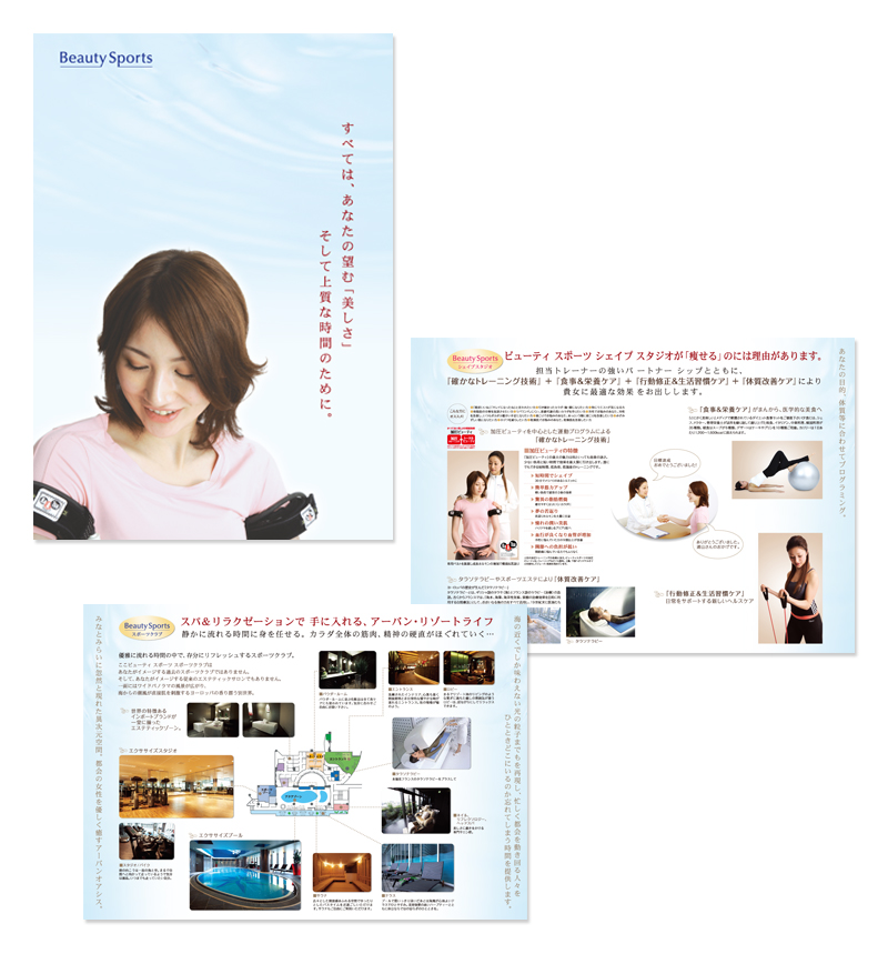 美と健康と癒しをテーマに、都会に暮らす女性にターゲットを絞り、アーバンオアシスをイメージして作成。スパでは非日常の楽園を演出し、シェイプスタジオでは「結果」が出る事を、スタッフを起用して伝達。紙質も手触りが良く、上質なものを使用。